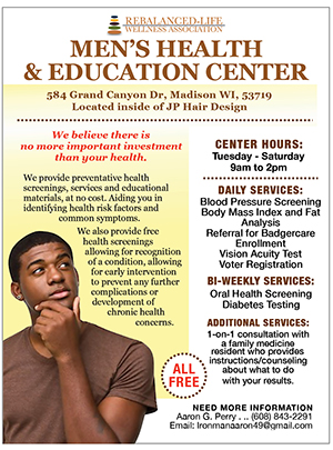 Through grants from SSM Health, the Men's Health & Education Center opened in 2016 at JP Hair Design in Madison. The center is a project of the Madison-based nonprofit Rebalanced-Life Wellness Association, founded in 2007. Aaron Perry, founder and president, has one goal: to improve the health — and therefore the lives — of African-American men across Dane County.