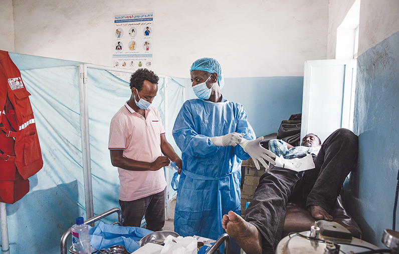 A surgeon prepares to operate on a man's severely infected toe inside the Sudanese Red Crescent Clinic in eastern Sudan in 2021. Sudan is on the watch list that the World Health Organization keeps of nations that are especially stressed by health care worker shortages. Photo by Nariman El-Mofty/Associated Press