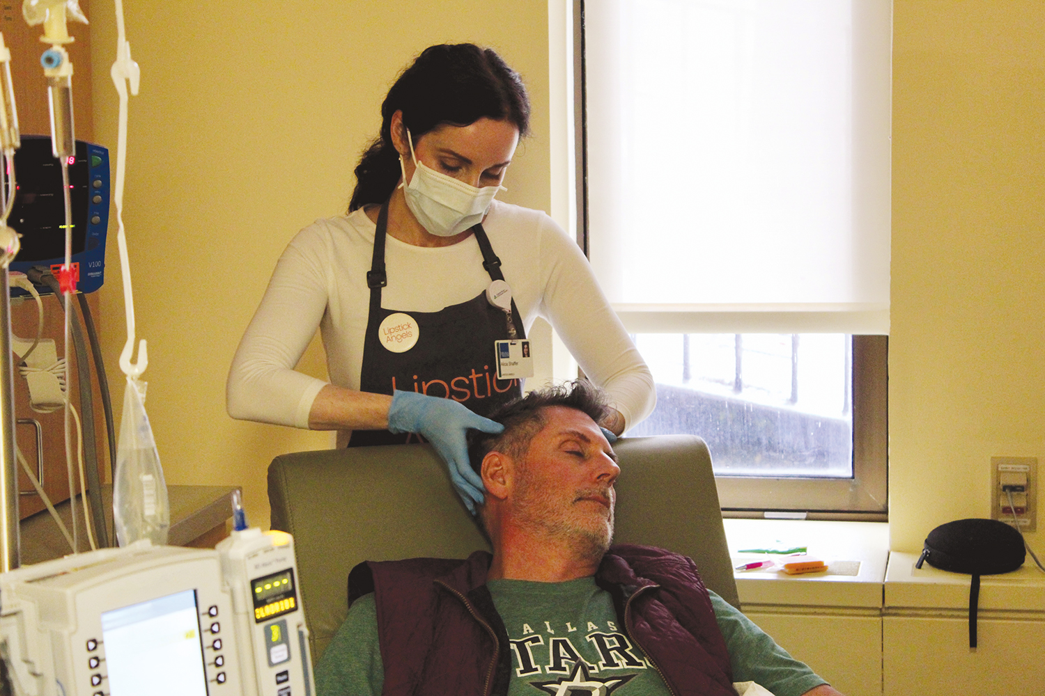 Patients are told ahead of time that it will be a Lipstick Angels day, and they can choose from the menu of services. The options include "Glow and Go," a custom makeup application; a hydrating facial; a gentleman's facial; "The Innersense Scalp Experience," which relieves scalp dryness and irritation with an organic scalp oil; "Easy Breezy Brows"; and a hand massage and treatment.