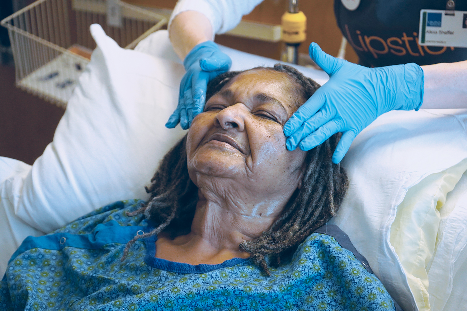 Alicia Shaffer gives a head massage to John Harnage, a patient at Virginia Mason Medical Center in Seattle. Shaffer is a program manager for Lipstick Angels. She and trained volunteers visit patients in hospitals and cancer centers to provide beauty and wellness services.