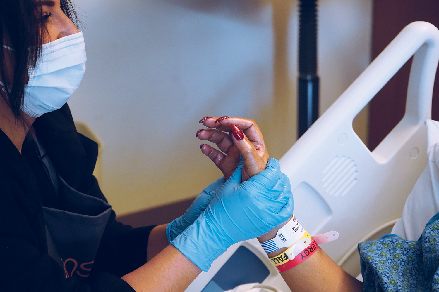 Mariela Marquez, a volunteer ambassador for Lipstick Angels, massages the hands of a patient.