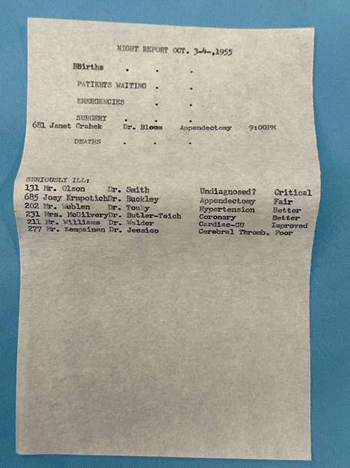 The time capsule included documents from the hospital, including this October 1955 night report on patients and their conditions.