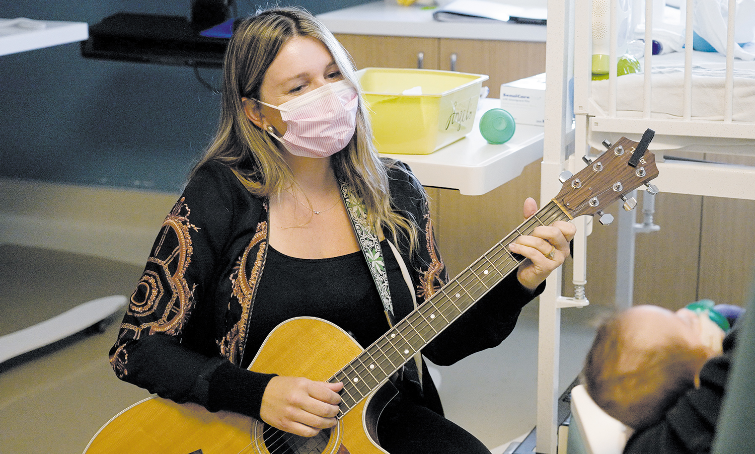 During her Friday visits, Creevey brings a guitar with nylon strings — research has shown this to be a superior instrument for achieving therapeutic benefit. Upon arrival she speaks with the charge nurse or other clinicians on the unit about who to prioritize.