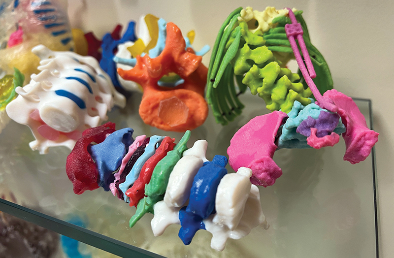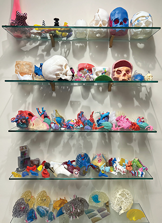Each model represents an effort to help or potentially change the life of a patient, many of them children. Pink, red and turquoise models of hearts represent those that need repair. A twisted green spine represents that of an infant with severe scoliosis. A white skull with multicolored pieces around the nose represents a plan for repair after a traumatic injury.