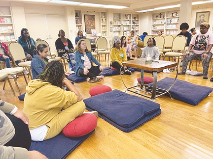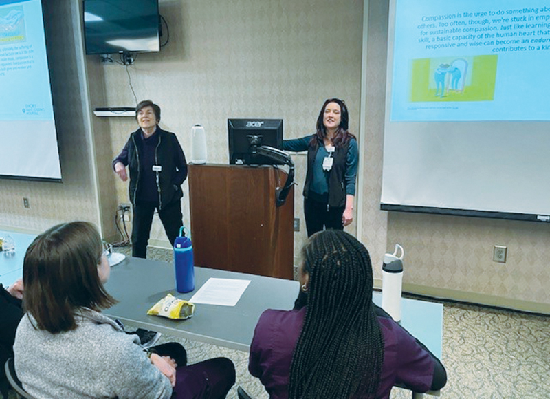 During a training session in May at Emory Saint Joseph's Hospital in Atlanta, Janet Clark, at left, and Cheri Tiernan speak to the participants. Clark and Tiernan are Saint Joseph's chaplains and Cognitively Based Compassion Training trainers.