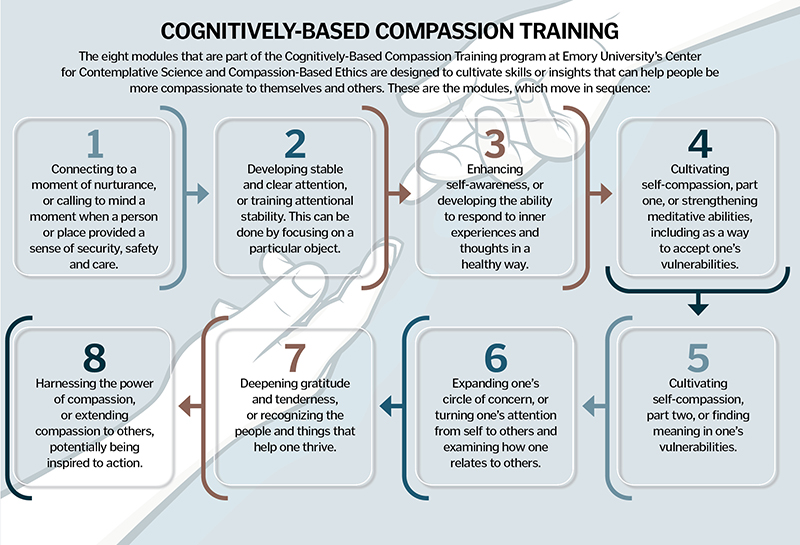 The ethics center offers various iterations of its Cognitively Based Compassion Training. The center's programming leads participants through eight modules. Each module teaches different skills or insights to build inner capabilities that deepen compassion toward oneself and others. Many of the skills are rooted in contemplative practices of Tibetan Buddhism, but the programming has been designed to be secular and to meld with each participant's particular religious tradition or belief system.