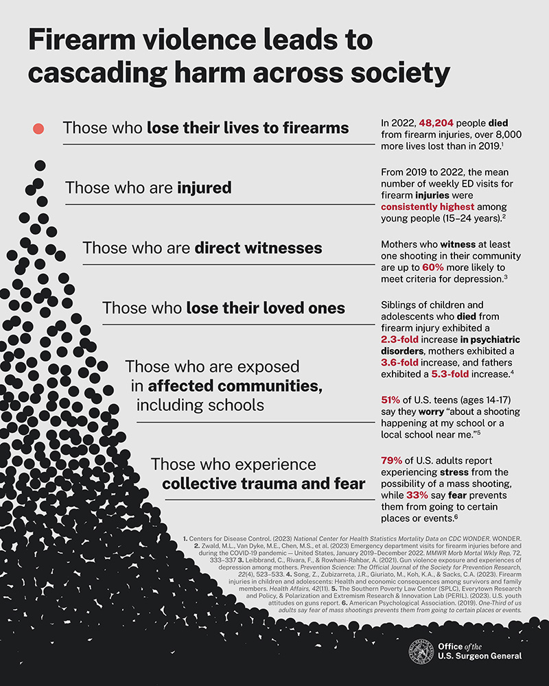 The problem is growing: The advisory says that in 2022, 48,204 people died from firearm-related injuries, over 8,000 more deaths than in 2019 and over 16,000 more than in 2010. Those deaths include suicides, homicides and unintentional deaths.