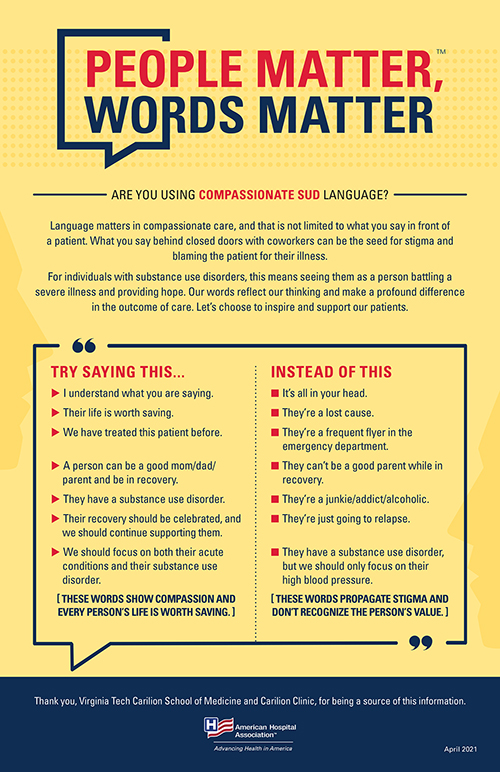 The campaign cites preferred language to use when speaking or referring to people with substance use disorders, and addresses other issues such as mental health, eating disorders and suicide. Posters and fliers reach visitors and caregivers who aren't otherwise trained.