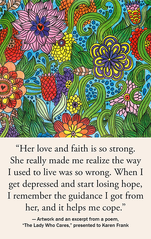 Karen Frank, is a nurse and the market director of quality at CHI Memorial Hospital in Chattanooga, Tennessee. She is also a certified anti-stigma instructor. One patient with substance use disorder presented her with a drawing of flowers and a poem he wrote about her called "The Lady Who Cares."