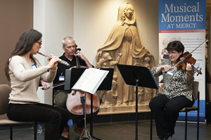 The musicians tailor their repertoires to the performance space. For example, a flutist, cellist and violist delivered a merry rendition of Scott Joplin's "Ragtime" in the bustling lobby; and a harpist has performed classical tunes to calm patients in the hospital's dental clinic, known as Mercy's Dental Services.