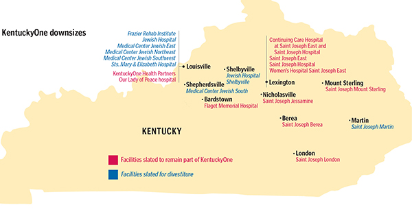KentuckyOne Health of Louisville, Ky., plans to restructure its operations, divesting of nine of its facilities — most of them in Louisville — and retaining eight facilities. The system, the largest health care provider in the state, said in a press release that its goal is to "focus its operations on a smaller footprint centered in central and eastern Kentucky," although it is retaining one Louisville hospital.