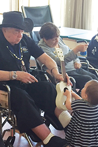 The weekly Babies & Grands Music class welcomes elders living at the facility and the pint-sized troubadours — ages six months to three years — for 45 minutes each week of singing, laughing, playing instruments and making new friends. The together time begins with a hello song and then continues with finger plays, music making, and games to make cleanup fun.