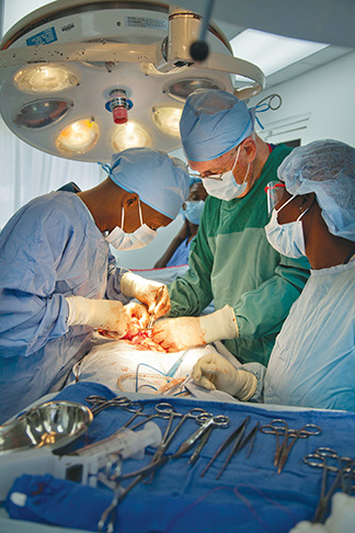 Dr. Harold Prévil, left, and Dr. David Butler, center, perform a surgery in 2020 at Hôpital Sacré Coeur. Butler, a Holy Name obstetrician, has completed many mission trips to Haiti over the past 32 years.