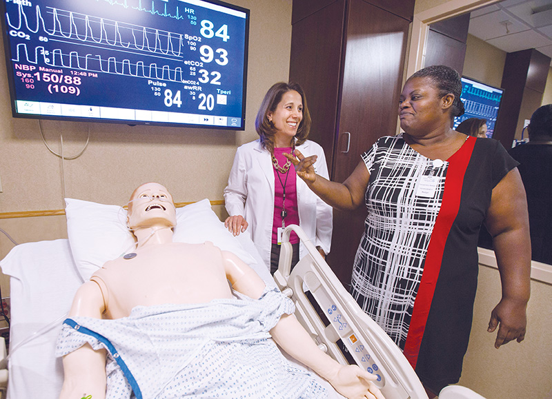 Cedar Wang, Holy Name vice president for nursing, left, provides training to Nirva Fils-Aime, director of community services at Hôpital Sacré Coeur in Haiti. The two are at the Russell Berrie Institute for Simulation Learning at Holy Name Medical Center in Teaneck, New Jersey. Some Milot, Haiti, providers travel to the U.S. for training.