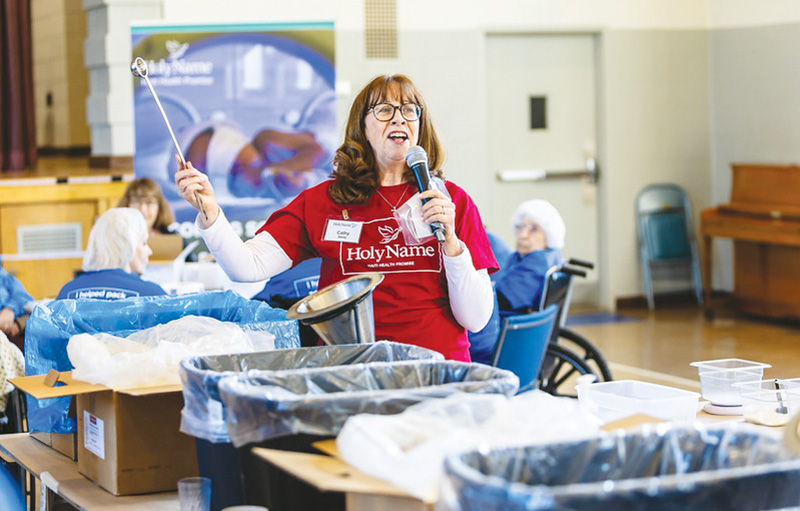Holy Name Foundation President Cathy Davey demonstrates the food packing process during an April packathon sponsored by Peace Ministries at Holy Name's Sister Claire Tynan School of Nursing in Englewood Cliffs, New Jersey.