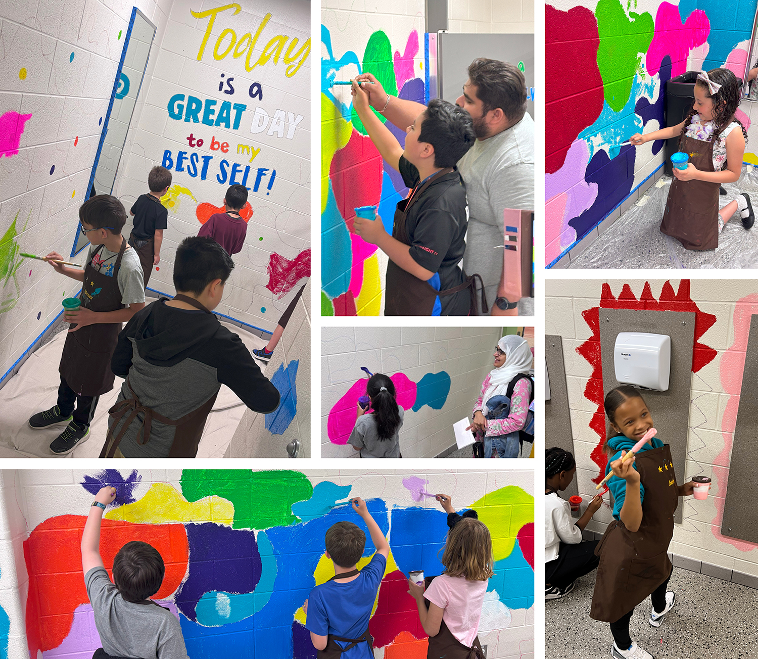 After leading multiple kindness-focused student art projects throughout the year, Bennett ended school in May with a community art project. In student bathrooms, she roughed in large splatter designs then invited students, parents and staff to choose the shapes they wanted to paint and the colors they wanted to use.