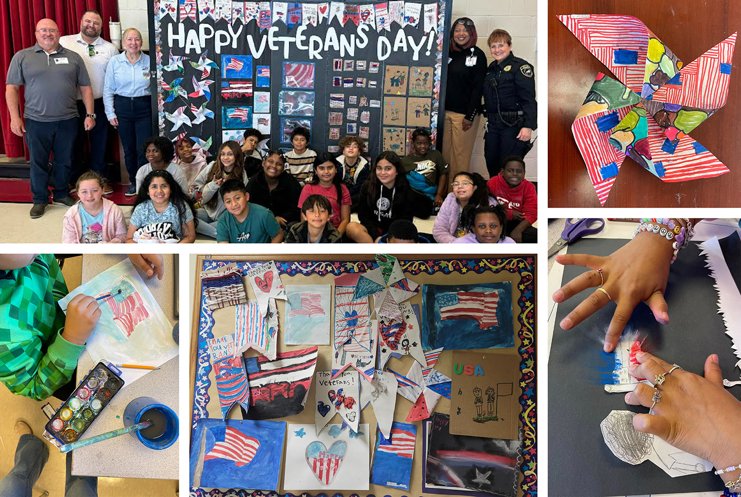 For Veterans Day, she worked with students to make artwork that they then arranged into a traveling display. That display served as the backdrop for an assembly honoring members of the military, and then the school gifted the display to a local veterans' center.