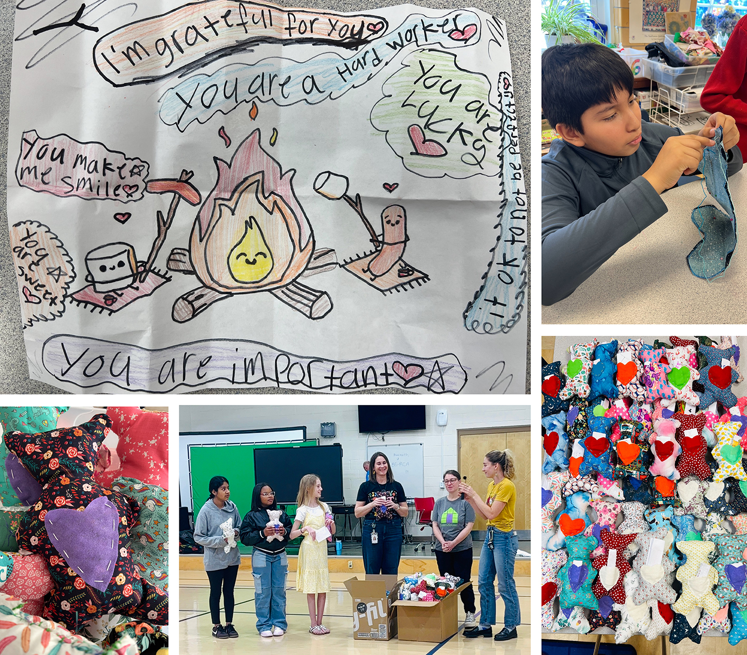 Arlington Elementary art teacher Kristen Blaker used the grant to purchase sewing materials, then led hand-sewing instructions for all the students at Arlington. She worked with the fourth and fifth graders to hand-sew teddy bears with a heart pocket on their chest. The students filled the bears with lavender from the school's garden for aromatherapy benefits. The students wrote personalized notes for the recipients, folded them up, and put them in each bear's heart pocket.