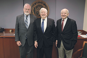 CHA paid tribute to Michael F. Rodgers, its senior vice president of public policy and advocacy, at a reception in its Washington, D.C., offices just prior to his retirement Jan. 31. During his august career as an advocate, Rodgers championed the Children's Health Insurance Program, the Affordable Care Act and other legislation important to CHA members and the health of the nation and its health delivery system. He is shown here flanked by John Rother, left, president and chief executive of the National Coalition on Health Care, and Ed Howard, founder and former chief executive of the Alliance for Health Reform, now known as the Alliance for Health Policy.