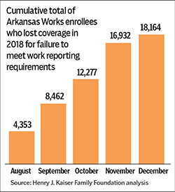Smith said it is thought that the large losses in Medicaid eligibility likely reflect the difficulties that those who are not exempt from filing monthly reports of their work activity to the state encounter because they either do not have access to a computer and an internet connection or they have difficulty navigating the online reporting portal. The state began allowing people the option to report work activity by phone beginning Dec. 19.