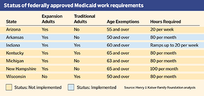 The work requirements initially affected Medicaid beneficiaries age 30 to 49. On Jan. 1, the work requirements were extended to beneficiaries age 19 to 29. Enrollees who fail to comply for any three months lose coverage for the rest of the calendar year and are barred from reapplying for coverage until the following January.