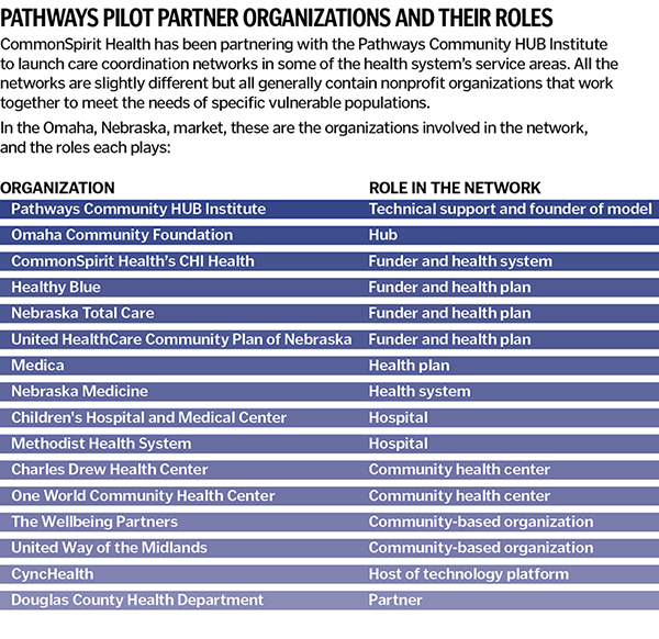 The Pathways work is an offshoot of CommonSpirit's ongoing efforts around what it calls Community Connected Networks. These networks link clinical care providers and social service organizations within a referral system and technology platform to address people's needs.