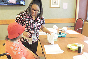 Monica Macias, right, became a nursing assistant at Cerenity Senior Care — Humboldt in St. Paul, Minn., after learning about the profession through a public high school program at Guadalupe Alternative Programs. Here she assists resident Marcella Marzitelli. Bath-sheba Kemp
