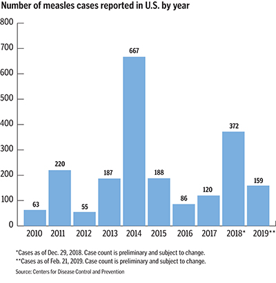 Based on its preliminary numbers, the Centers for Disease Control and Prevention said there were 372 measles cases reported in 2018. There have been 159 cases this year, as of Feb. 21.
