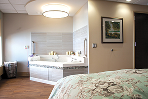 Each birthing suite has a standard queen-sized bed, spa-sized tub and shower as well as space and furniture to accommodate the family members attending the birth. Patients and their families have access to a communal lounge area, dining room and kitchen.