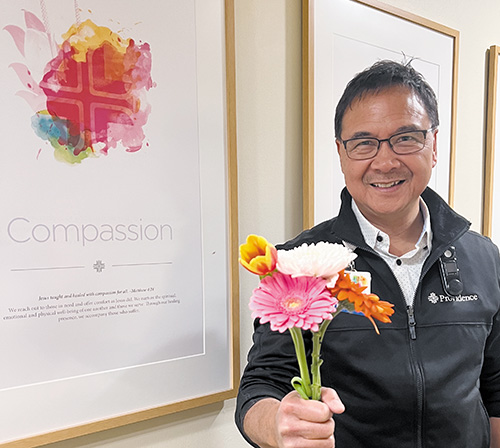 Members of his team identify which patients at the hospital, part of Providence St. Joseph Health, might need an extra boost. Then, they deliver a small vase of flowers to their room.