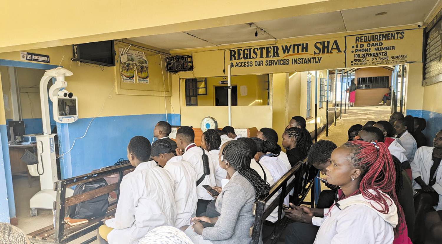 Leanna Ross, who is on screen on the device at the front of the room, leads a telehealth learning session for clinicians at Ndanai Sub County Hospital in Ndanai, Kenya. Ross is a med/surg professional development specialist with the Providence Clinical Academy and the Providence Nursing Institute, part of Providence St. Joseph Health.