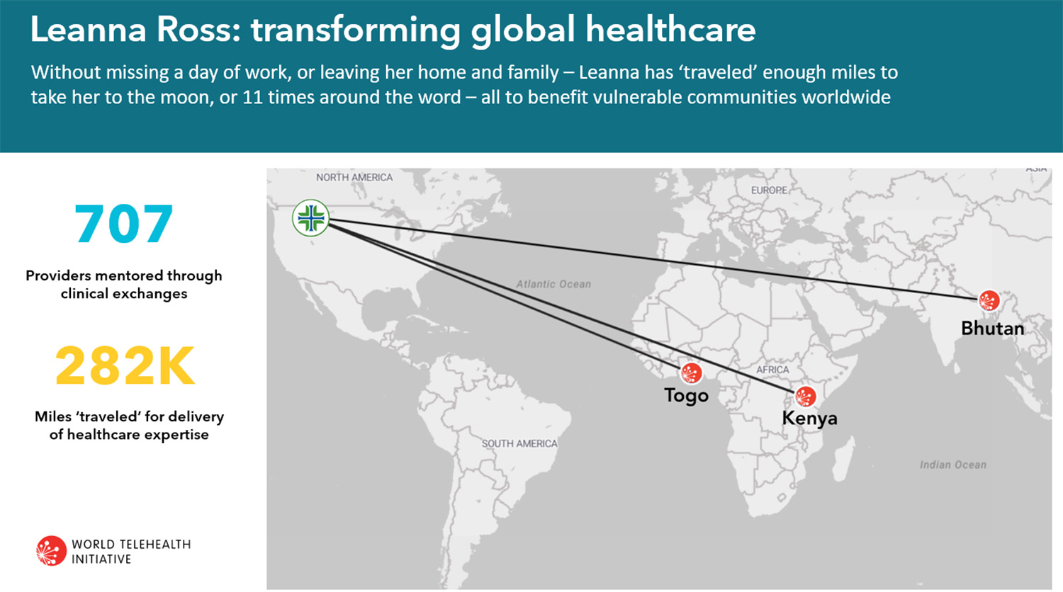 About two years ago, Ross saw one of these solicitations and signed on. She has fully embraced the role, conducting training sessions with providers thousands of miles away, primarily in Togo, Kenya and Bhutan. World Telehealth Initiative estimates Ross has trained more than 700 providers.