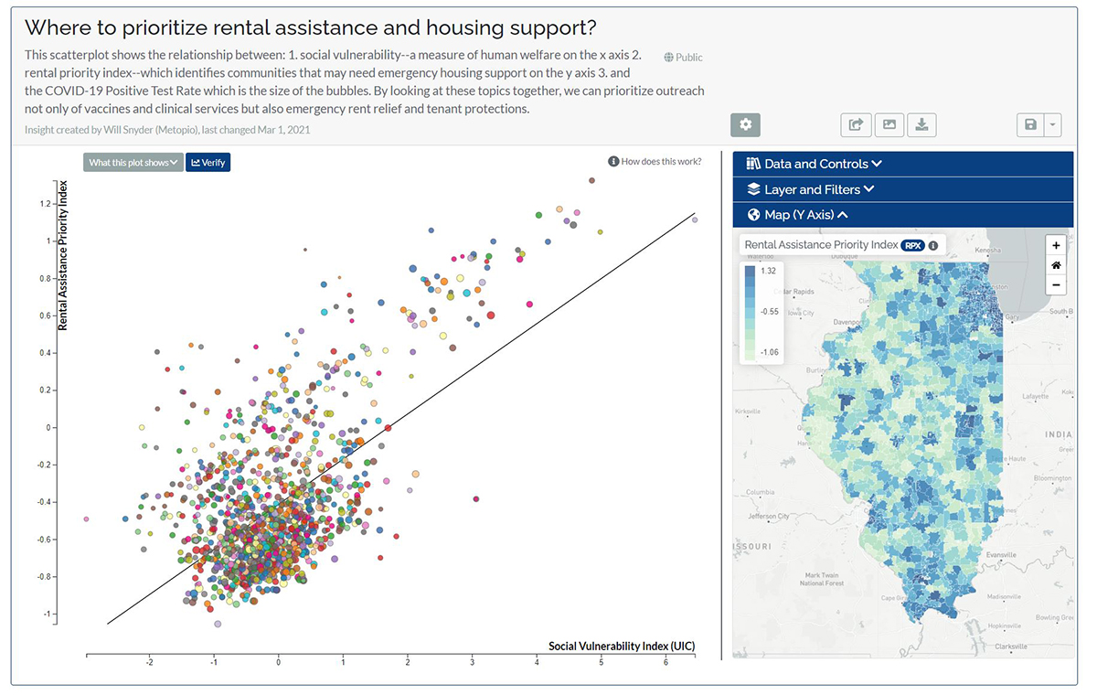 With a few mouse clicks, Metopio users can layer data from various sources including their own collections, zero in on populations or geographic locations, and create maps, charts and scatter plots that show the results.