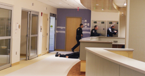 Although the drill was staged in the ER, hospital staff from every unit participated. Police and security officers, observers from other hospitals and community volunteers, all filled out evaluations, and their observations will be incorporated in an after-action report and security response improvement plan, Dupuis explained. One early learning was the importance of clear communication before, during and after an event, she said.