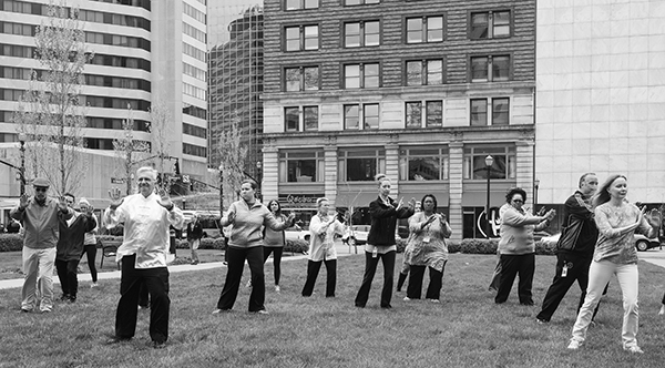 Louisville, Ky.-area community members unwind with a complimentary tai chi class from a KentuckyOne Health provider on April 15, the federal tax deadline. A KentuckyOne Healthy Lifestyle Center offered the session in downtown Louisville during lunchtime as a way for people to “de-stress” through the Chinese discipline that uses slow, meditative movements to promote relaxation and calm. In addition to tai chi, the three Louisville Healthy Lifestyle Centers offer medically supervised exercise, nutrition counseling, stress management and more.