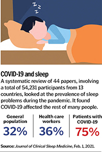 A systemic review of research papers published in Feb. 1, 2021, in the Journal of Clinical Sleep Medicine found sleep problems to be particularly pronounced during the COVID-19 pandemic. The review concluded that about 32% of people worldwide were having sleep problems with higher incidences among patients with COVID, 75%, and health care workers, 36%.