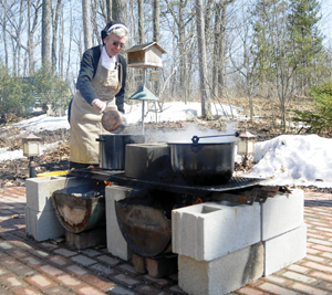 When the pot contents boiled down, Sr. Hembrecht added fresh sap. It takes about 20 hours to cook each batch. Sr. Hembrecht stirred the cauldrons and tended the fire, monitoring each batch more closely during the last several hours of cooking when scalding risk is high.