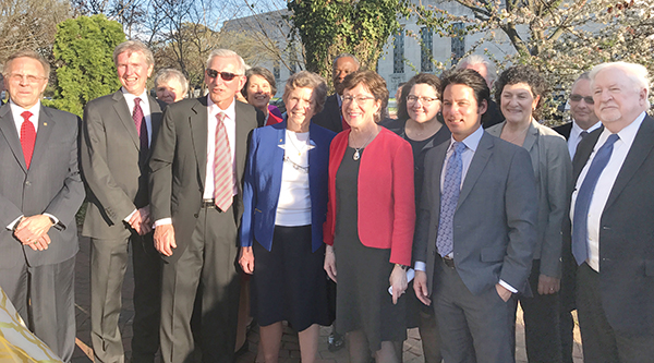 Sen. Susan Collins, R-Maine, shown center right in red jacket, praised the contributions of Catholic health care in the U.S. when she joined members of the CHA Board of Trustees at a reception at the Florida House on Capitol Hill, April 4. Board members and CHA staff, shown front row from left, are Michael A. Slubowski, Trinity Health president and chief operating officer; Kevin J. Sexton; Robert J. Henkel, Ascension Healthcare president and chief executive officer; Sr. Carol Keehan, DC, CHA president and chief executive officer; Michael R. Panicola, SSM Health senior vice president of mission, legal and government affairs; and Michael Rodgers, CHA's senior vice president of advocacy and public policy. In the back row are, from left, Sr. Patricia L. Rayburn, OSF, chair of the Sisters Sponsorship Council of Dignity Health; Cathleen P. Eldridge, a principal in Eldridge Consulting; Darryl Robinson, Dignity Health executive vice president and chief human resources officer; Dr. Carolina Reyes, MedStar Washington Hospital Center; Sr. Mary Haddad, RSM, CHA's vice president of mission services; and Michael Shea, president and chief executive officer of the Catholic Health Alliance of Canada.