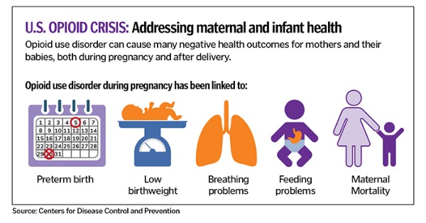 Rudolf says the substance that patients are misusing when they enter the program varies, but for more than 90% of them it is an opioid; more recently it is often synthetic opioids such as illicitly manufactured fentanyl. The Centers for Disease Control and Prevention report that the number of women with opioid-related diagnoses documented at delivery increased by 131% from 2010 to 2017. Opioid use disorder during pregnancy has been linked with preterm birth, stillbirth, maternal mortality, and neonatal opioid withdrawal syndrome.
