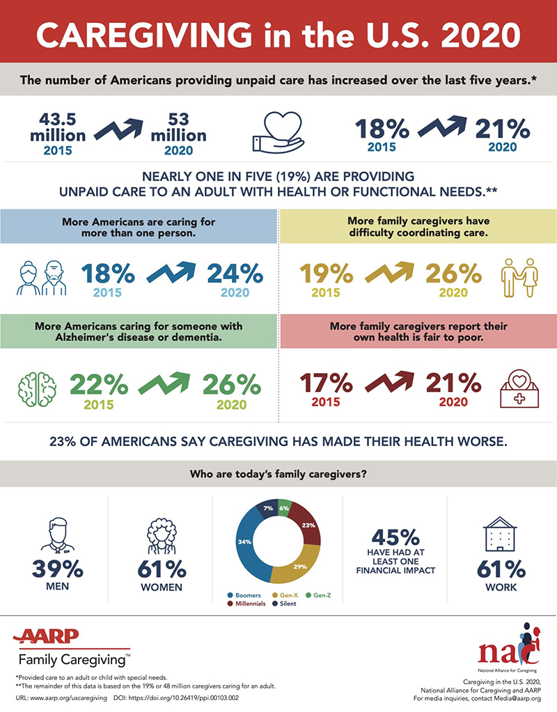 A 2020 report from the National Alliance for Caregiving says about 53 million people in the U.S. are unpaid caregivers.