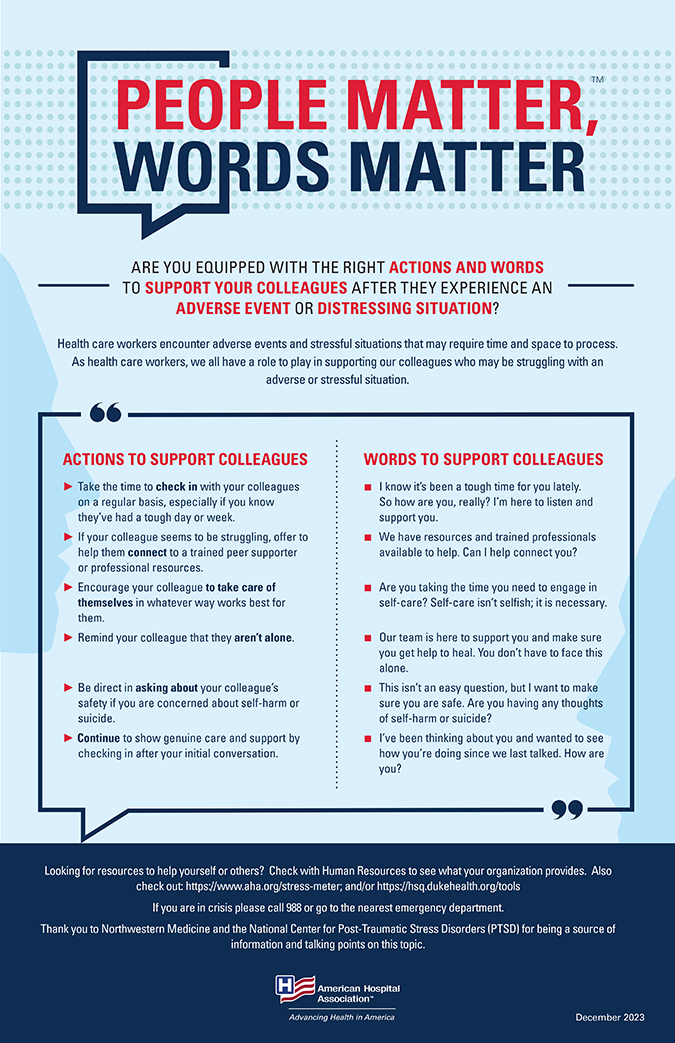 The posters have become some of the AHA's most downloaded resources, Steiger said. The association has asked members which topics it should address in the campaign and consulted with clinicians, administrators and other hospital stakeholders, external advisory groups, and others to develop the posters. AHA is working on posters on language to use regarding ageism and disabilities and having patients and family members look at and give feedback on the content.