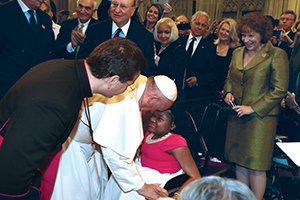 When Pope Francis saw Gabaud seated in her wheelchair along an aisle in the crowded cathedral, he approached her. She reached out to give him a hug. "He immediately gave me a kiss on the forehead and gave me a blessing."