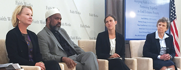 CHA President and Chief Executive Officer Sr. Carol Keehan, DC, shown at far right, was among panelists at an event highlighting the contributions of faith-based organizations working to advance human well-being in the developing world. The Sept. 22 luncheon conference in Washington, D.C., was hosted by the U.S. Agency for International Development in advance of Pope Francis' visit. Sr. Carol told the audience that religious congregations working in Africa, Central America and South America are effective because they have made long-term commitments and are trusted by those they serve. Among panelists were, from left to right, Amy Rauenhorst Goldman, chief executive and chair of the GHR Foundation; Imam Mohamed Magid, director of religious diplomacy for the International Interfaith Peace Corps; and Bethany Hoang, an advisor to the International Justice Mission.
