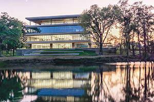 The four-story glass and steel open architecture building is perched on a lakeshore and nestled amid a stand of trees in a quiet and relatively secluded setting, given that it's just a few hundred yards from a busy intersection in suburban St. Louis. The facade is enhanced by a tall, vertical light feature called the Lantern, which symbolizes Mercy's call to share light with others. The chapel is just inside the front entrance. And, dominating the first-floor atrium is the Pioneer Wall, an array of 10-foot video screens that project photos from the late 1800s and early 1900s of the system's founders, the Sisters of Mercy. The order is known as the "walking sisters" because they sought out, and walked among, those they served.