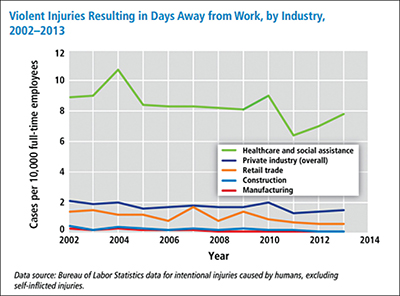 Federal statistics show the threat of workplace violence is much higher for health care workers than for other workers. In 2017, the number of nonfatal intentional occupational injuries from assaults nationwide was 18,400, according to the U.S. Bureau of Labor Statistics. Of those, 13,080 were in health care or social service settings. Those numbers have risen steadily since 2011, when the overall number was 11,690 and the number for health care or social service settings was 8,180.