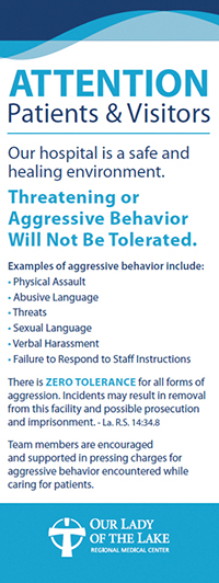 Barrett said the ER and behavioral health unit have been the scenes of most incidents of aggression at Our Lady of the Lake and she attributes that to the higher states of stress and trauma patients and visitors in those units tend to be under. One of the committee's initiatives was to post stern warnings to patients and visitors that threatening or aggressive behavior will not be tolerated. "Incidents may result in removal from this facility and possible prosecution and imprisonment," the warnings state.