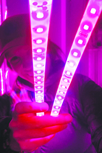 After being sown into a spongy plug of peat moss and other organic matter, seeds are sprayed with nutrients and water, and nested under lights that produce an artificial day/night cycle. When the sprouts grow to about 1 to 2 inches, they are stacked — spongy plug and all to protect the root structure — into thin vertical towers. Nutrient-enhanced water trickles down parsimoniously from plant to plant. LED full-spectrum lights stimulate photosynthesis.