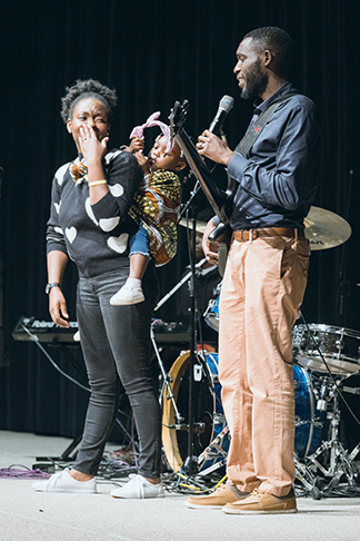 Paul Kalusa, 29, a survivor of colon cancer, performed an African praise medley with his family — he played bass guitar. Here, Kalusa speaks at the talent show as his wife, Irene Nabutono, looks on, with the couple's daughter, Isabella, on her back.
