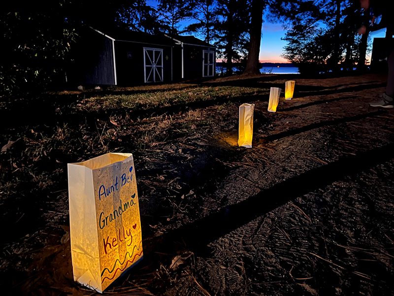 Luminarias with names of deceased family members line a walkway at Mikey's Camp, a part of a program called KIDZ'NGRIEF. The program, which offers support grieving children and teens, is a ministry of Bon Secours Mary Immaculate Hospital in Newport News, Virginia.