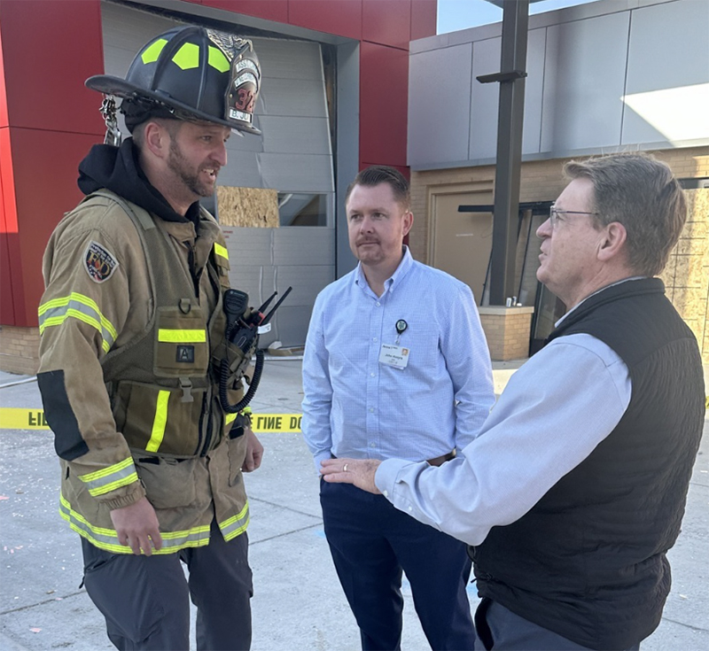 From left, Dr. Brian Jundt, a family practice provider at Avera St. Anthony Hospital in O'Neill, Nebraska, and also a member of the O'Neill Fire Department; John Kozyra, president and CEO of Avera St. Anthony's Hospital; and Jim Dover, president and CEO of Avera Health, discuss damage to the hospital caused by a gas explosion nearby on Oct. 7.